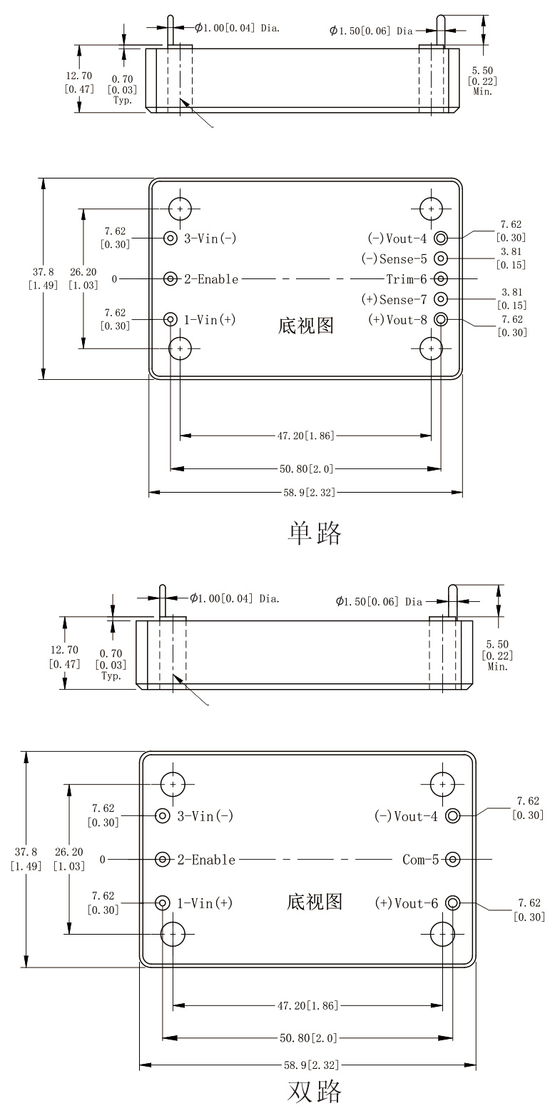 2. 單路引腳4、8直徑1.50mm.(0.06in.)。