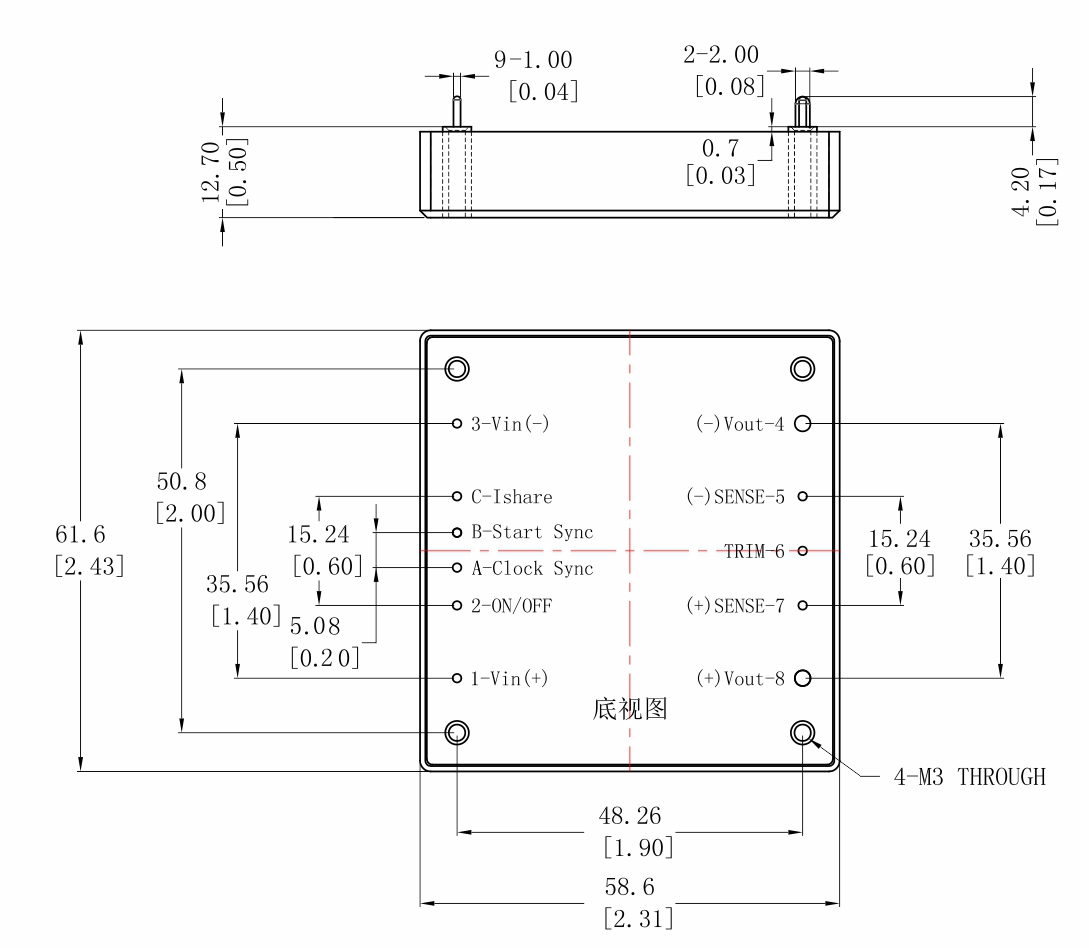 1. 所有尺寸标注單位爲毫米(英寸)。